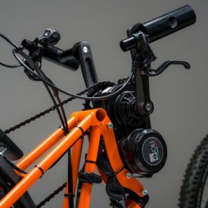 Le sospensioni sono ad Aria. Una volta regolata la pressione per avere un affondamento ottimale al tuo peso, avrai un handbike reattiva e stabile nella guida. Senza subire le asperità del terreno. Una levetta di blocco ti consentirà di irrigidirle in caso di necessità.
